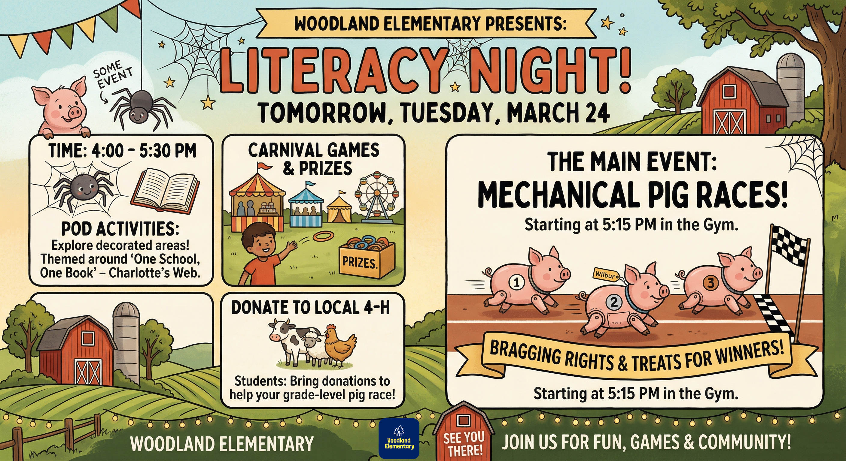 Dear Woodland Families:We are excited to invite you to our annual Literacy Night tomorrow, Tuesday, March 24, from 4:00 PM to 5:30 PM. It’s going to be a night filled with reading, racing, and comm...