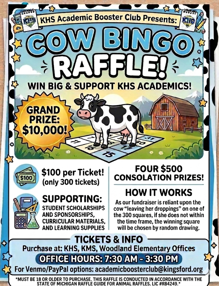 The Kingsford High School Academic Booster Club (ABC) is now selling tickets for our popular Cow Bingo fundraiser!Interested in joining the fun? You can purchase a ticket by contacting any ABC memb...