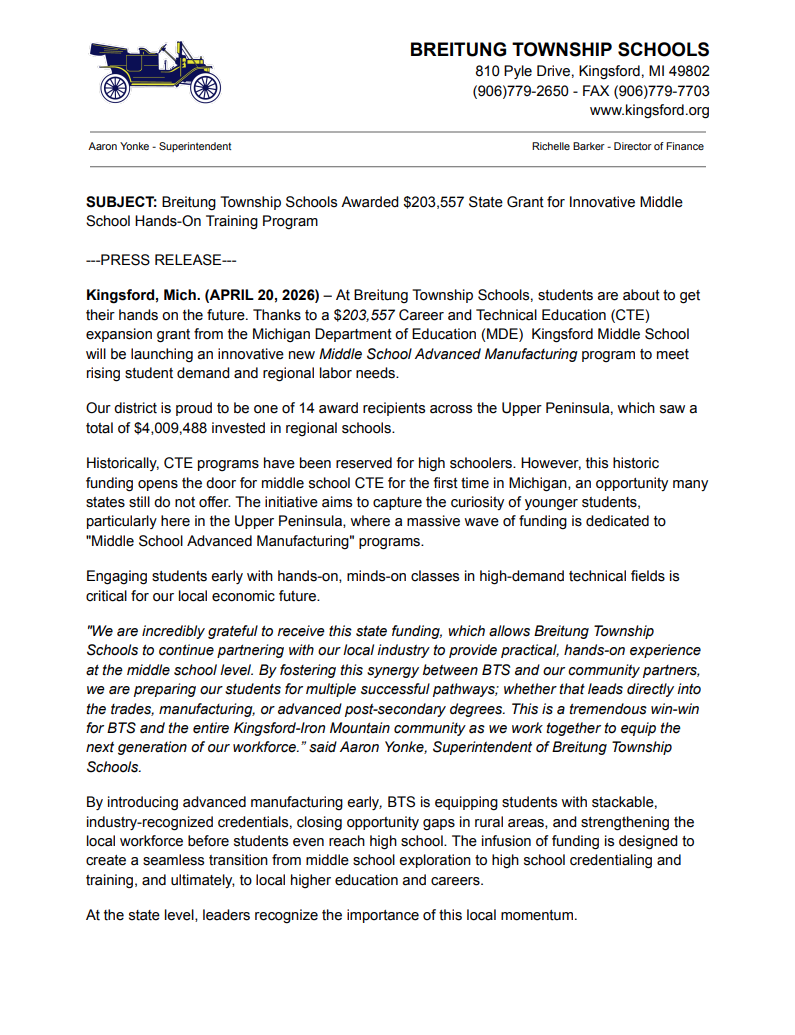 Nominations for the Breitung Township Schools Achievement Hall of Fame are due May 1st!This is a great opportunity to recognize individuals who have made a lasting impact on our schools and communi...